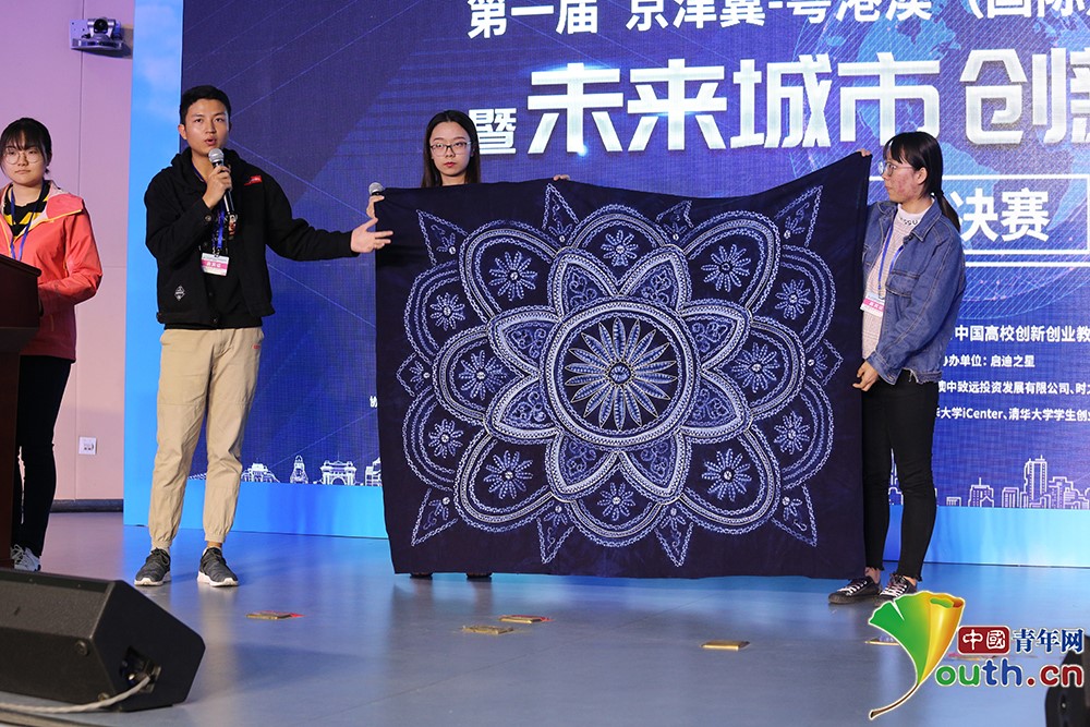 中央民族大学“叙·扎染”艺术创意研发团队上台对国家非物质文化遗产扎染技术的创新与应用进行展示。中国青年网记者 叶婉莹摄