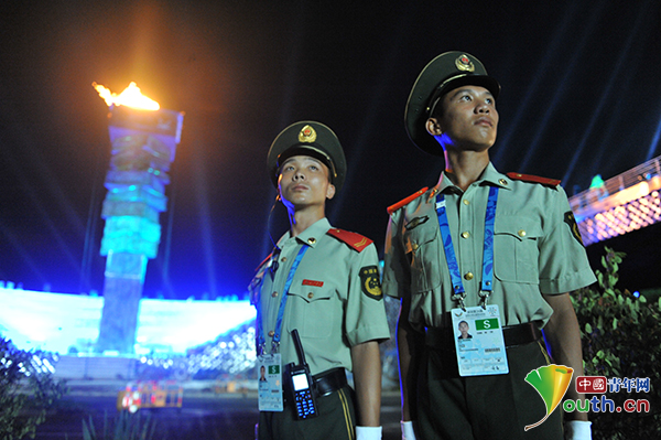 主火炬的光照亮了执勤官兵满是汗的脸庞,尽管一转头就能看到,但是他们始终坚守岗位,眼里只有警戒区域的安全。武警广东总队深圳支队供图
