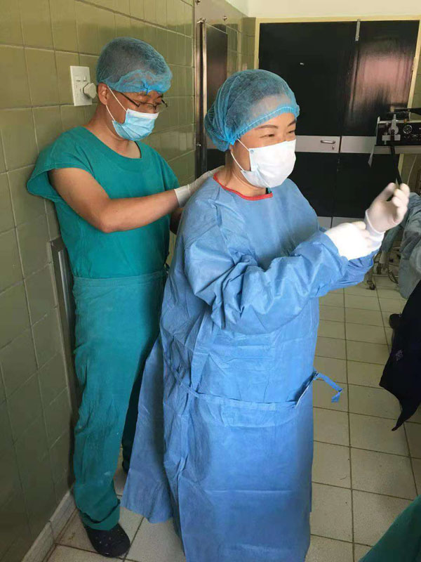 出国前,桂希恩教授为医疗队做过职业暴露培训,要求一旦被针扎到手,一定要进行检查并服用阻断药一个月,再接受检查。李进表示,医疗队严格按安全流程操作,手术时跟国内相比会穿上套靴和围裙。