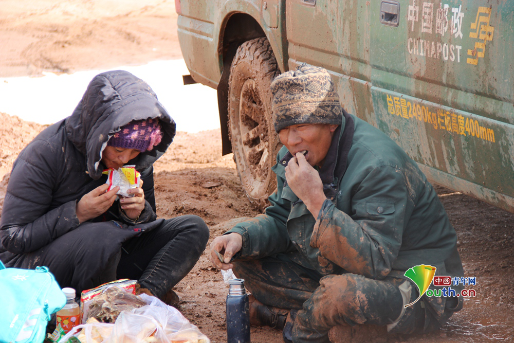 益西卓嘎与嘎尼玛在送邮途中以方便面充饥。本人供图