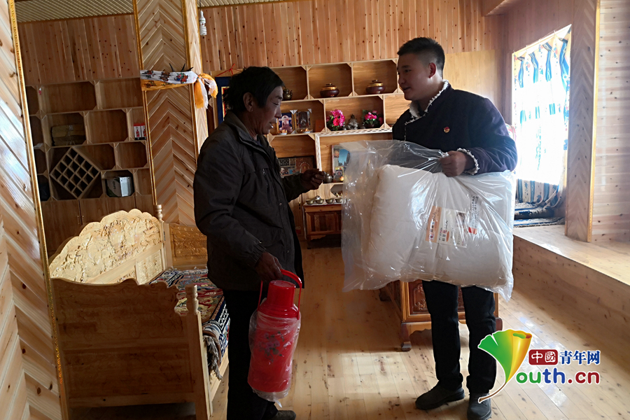 冲郎加(右)为村里的贫困户送去慰问品。本人供图