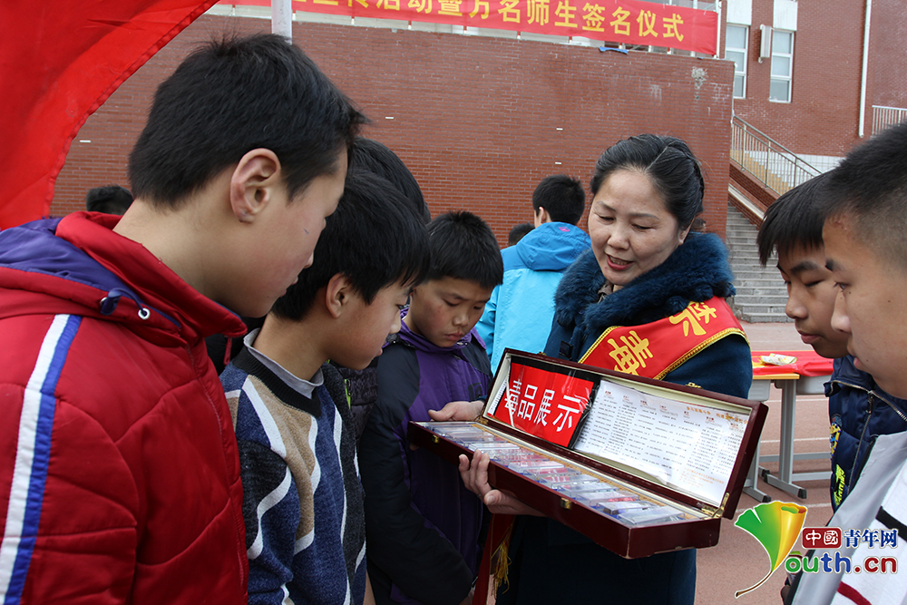 2017年陈红在宿州市十一中向同学们展示毒品知识。本人供图