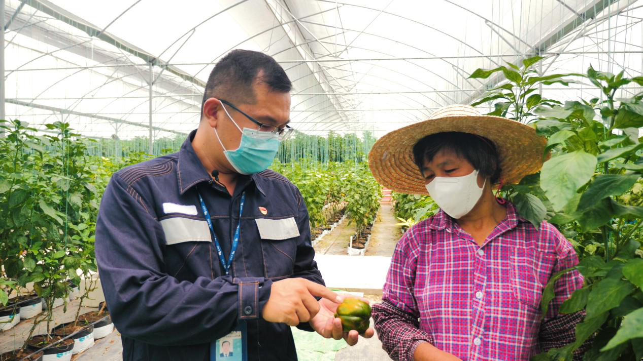 疫情期间,高锋驱车回到定点扶贫村肇庆市林洞村内,在春耕之时和农户一起在彩椒种植大棚内研究彩椒品种。谭茂茜摄