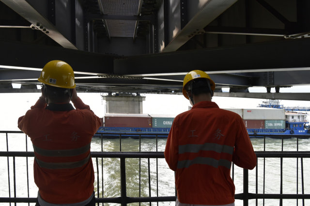 除了要防止大船撞上大桥,党颉明和工友还要定时穿过290米的箱梁到钢梁下,观察大桥螺栓有没有断裂,桥墩有没有被船只擦伤,发现故障或隐患都需要及时排除。
