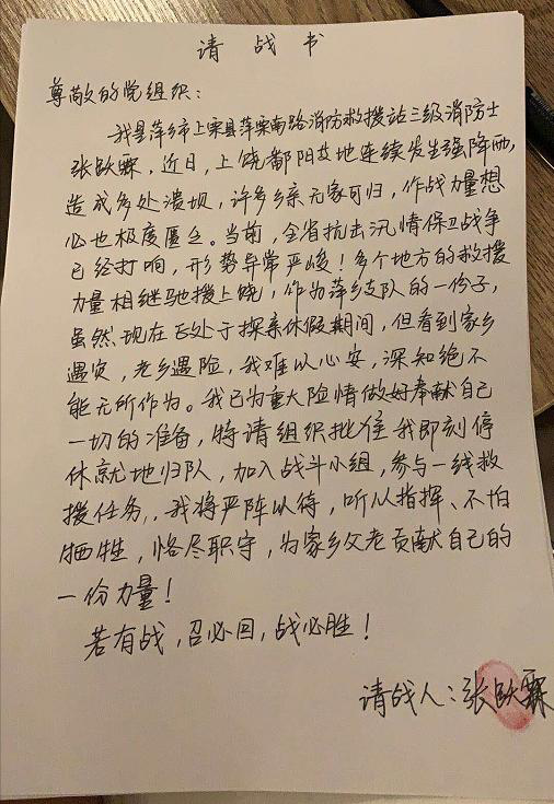 临时党支部收到这份请战书之后,当即同意他归队参与救援。