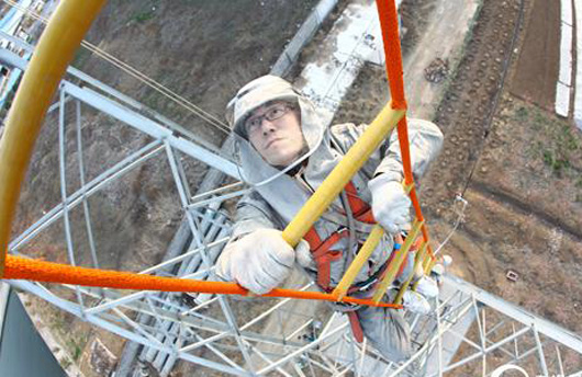 在1000千伏特高压交流输变电山东段,王进带领工友们进行通电前的最后验收。从地面到塔顶接近60层楼的高度,王进要借助于886根攀爬脚钉,徒手攀爬上去。