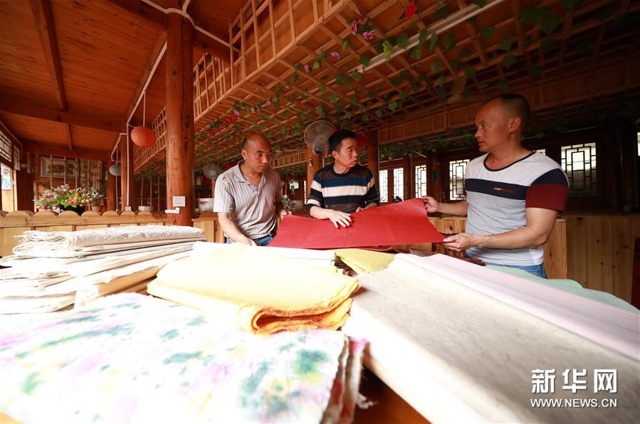 4月24日,在贵州省丹寨县南皋乡石桥村手工皮纸展示馆,王兴武(中)和工匠们在讨论彩色手工皮纸的工艺改良技术。 新华社发(黄晓海 摄)