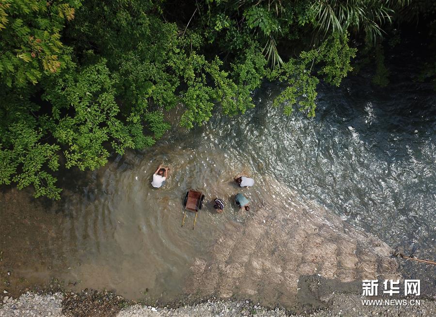 4月24日,在贵州省丹寨县南皋乡石桥村,工匠们在河里清洗造纸原料(无人机拍摄)。 新华社发(黄晓海 摄)