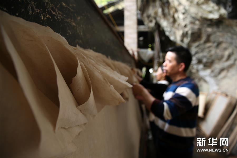 4月24日,在贵州省丹寨县南皋乡石桥村皮纸作坊,王兴武在查看烘干好的手工皮纸。 新华社发(黄晓海 摄)