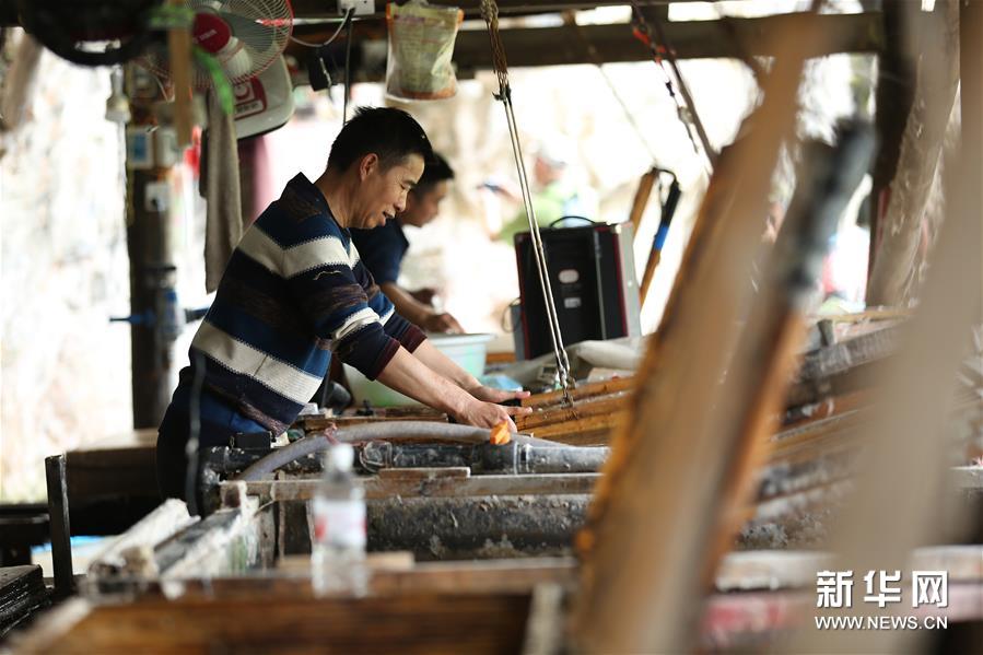 4月24日,在贵州省丹寨县南皋乡石桥村皮纸作坊,王兴武和工匠们在制作手工皮纸。 新华社发(黄晓海 摄)