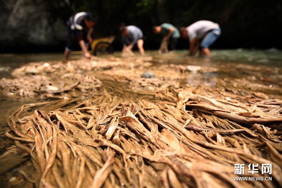 4月24日,在贵州省丹寨县南皋乡石桥村,工匠们在河里清洗造纸原料。 新华社发(黄晓海 摄)