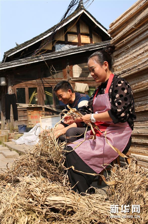 4月24日,在贵州省丹寨县南皋乡石桥村,王兴武(左)和妻子在处理刚刚收购的造纸原料。 新华社发(黄晓海 摄)