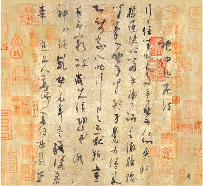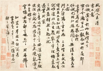 第三单元“我书意造本无法”,展出苏轼《治平帖卷》《归院帖卷》和《春中帖页》三件作品,其中《治平帖卷》最接近苏轼早年书法的特征,对于想了解他书法渊源的人颇有帮助。而苏迈的《跋郑天觉画页》是今人走近这位跟随父亲漂泊四方的长子难得的机会。在董其昌临习前贤的众多书法作品中,苏轼也是重点,本展有他的《临苏轼杂帖卷》。本单元压轴的展品无疑是五代时期“孤绝一枝”的书法家杨凝式的《神仙起居法卷》。无论是苏轼,还是他的学生黄庭坚及晚辈米芾,都从这位被时人称为“杨疯子”的前贤书法中汲取了“尚意”的精神。