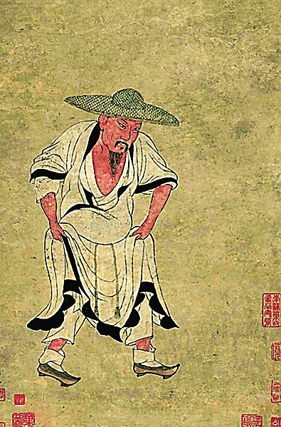 画像最清晰的当属明代的朱之蕃《临李公麟画苏轼像轴》。这幅苏轼笠屐像所据粉本传为苏轼友人李公麟之作。苏轼晚年被贬海南时,曾在访友途中遇雨,他向农人借来斗笠和木屐,农人争相笑看,而苏轼坦然处之。此图表现苏轼身处逆境而安之若素的生活态度,此类笠屐像也成为后世在描绘苏轼形象时的一种经典范式。此画是1949年以来首次公开亮相。