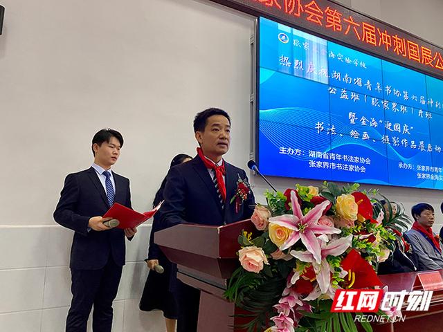 红网时刻张家界9月28日讯(通讯员 胡志翔 覃龙 田冬梅)翰墨薪传,弘扬国粹。9月27日上午,湖南省青年书协第六届冲刺国展公益班(张家界班)开班暨金海“迎国庆”书法、绘画、摄影作品展启动仪式在张家界金海实验学校举行。中共张家界市委宣传部副部长赵富生宣布活动启动。湖南省书法家协会驻会副主席兼秘书长胡紫桂,省青年书法家协会执行主席李巍波、副主席彭灿辉,市文联副主席、市书法家协会主席向远刚,市文联党组成员、四级调研员杨次洪,张家界金海实验学校校长王宏星出席开班仪式。来自全市120多名书法爱好者报名参加培训。