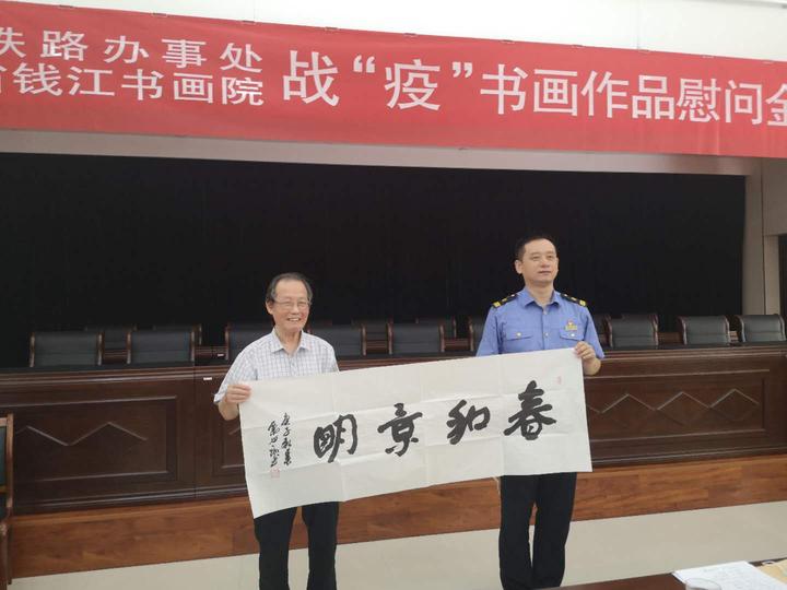 2.助力抗疫,慰问基层一线群英。疫情就是命令,防控就是责任。在深入贯彻落实习近平总书记重要指示精神、贯彻落实省、上海局集团有限公司要求中,围绕坚决打赢疫情防控的人民战争总体战阻击战主题,浙江省钱江书画“两院”开展三次书画慰问抗疫防控基层一线群英活动。在全国“两会”召开、全国疫情防控阻击战取得重大战略成果,统筹推进疫情防控和经济社会发展工作取得积极成效的重要时刻,杭州铁路办事处,浙江省钱江书画院暨浙江省钱江书画研究院开展“走进基层、慰问群英、战‘疫’书画作品敬送一线”活动,组织书画师围绕现实题材,创作出有筋骨、有温度,具有感染力的战“疫”作品130幅,致敬一线抗疫先进。