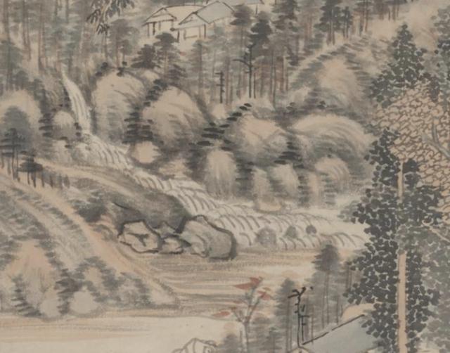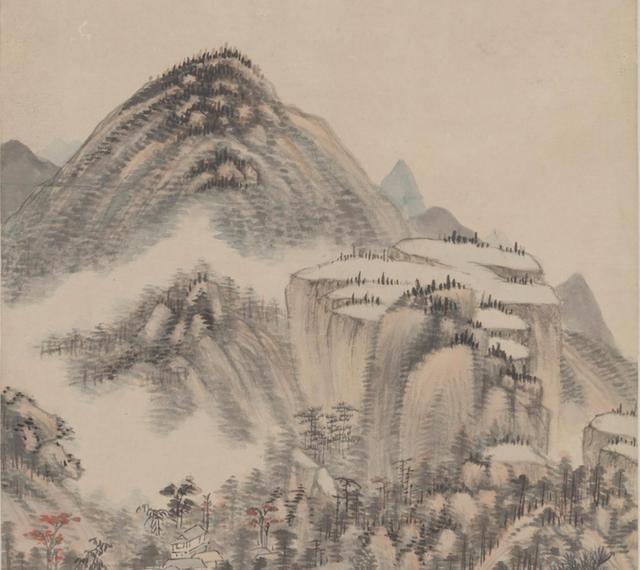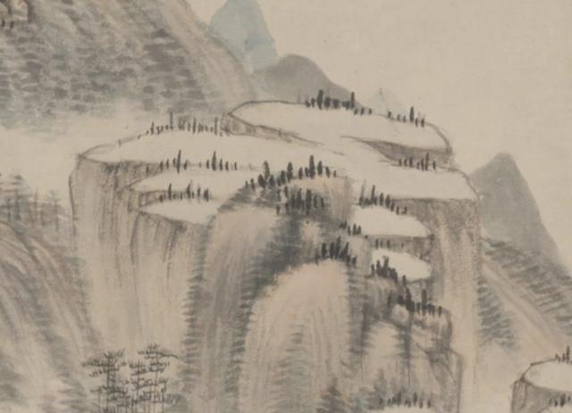 这幅画采取全景式布局,远山由两座山峰构成,高处的山峰尖顶缓坡、植被茂密。