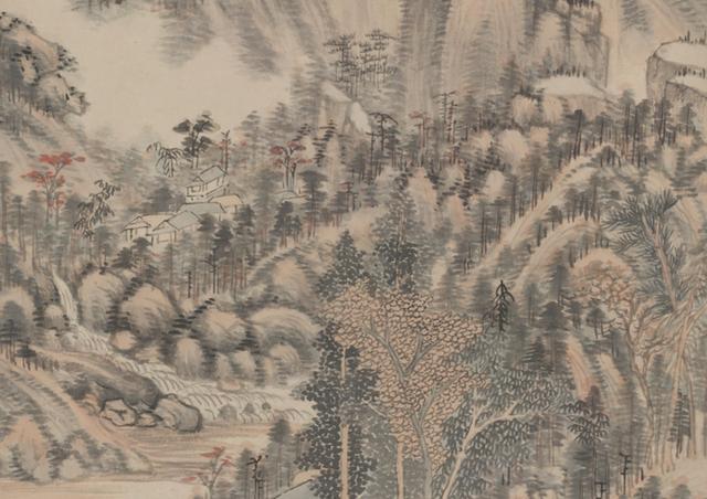 中景处,山石密布,林木繁茂,几间房舍掩映在树石之间。