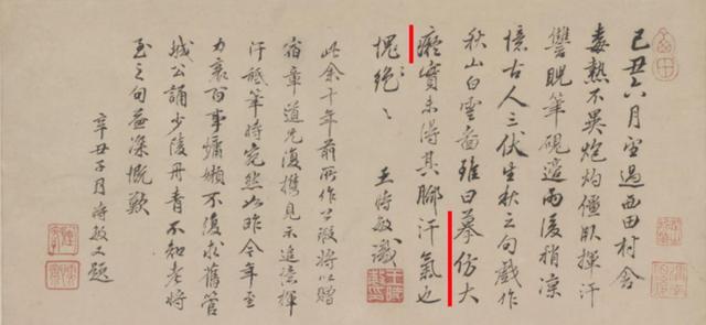 通过阅读画作上方的题跋,我们可以知道,这幅画是王时敏仿元代画家黄公望的笔意而创作的一幅秋景图。