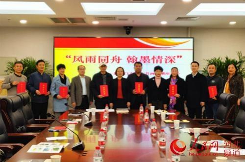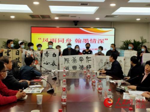 书画艺术家代表向河北省直援鄂抗疫人员代表捐献书画作品。 杨文娟摄