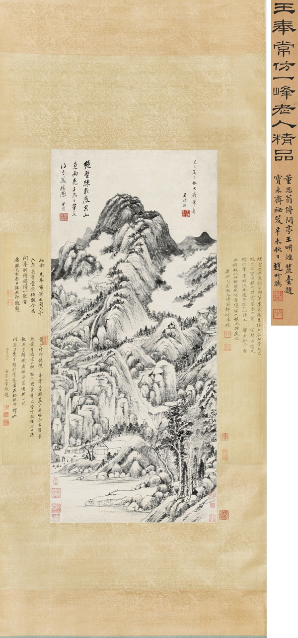 永乐2020全球首拍古代书画板块集结历代130余件重要书画家的扛鼎之作。该专场的领衔作品王时敏的《仿黄公望山水轴》,裱边及本幅上有四家跋语,董其昌书于本幅左上角,正值其人书俱老的晚年书法,亦能看出其对王时敏绘画的肯定和认可;另三家分别为博尔都、王原祁书于康熙乙亥(1695)及王翬书于康熙丙子(1696),距此画完成已六十六年,其时该作已为博尔都收藏。一件画作,在完成后的六十七年间,先后三位画坛领袖以及一位清宗室的重要收藏家题跋,可见其分量之重、艺术价值之珍贵。另董其昌、博尔都的印鉴分别著录于上海博物馆编《中国书画家印鉴款识》和王季迁、孔达着《明清画家印鉴》。此作递藏有序、装潢考究。近代鉴定巨擘徐邦达曾观此作后云:“烟客作画,贵在秀润,董书王跋,至宝也。”