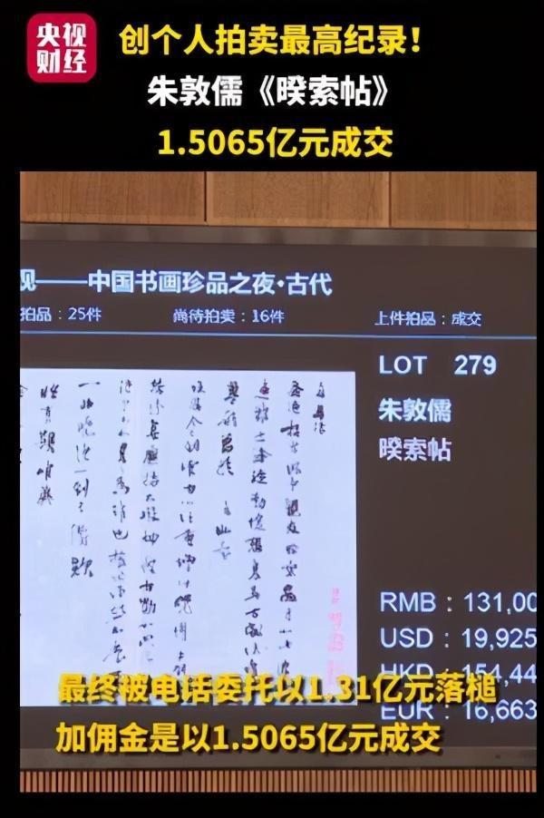 拍卖到了午夜,另一幅备受关注的作品,宋代词人朱敦儒的书法《暌索帖》以1.08亿元起拍,随即网络买家1.1亿元紧跟,最终电话委托买家以1.31亿元胜出,加佣金以1.5065亿元成交,这一价格也创造了朱敦儒个人作品拍卖的最高价纪录。
