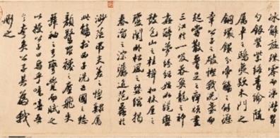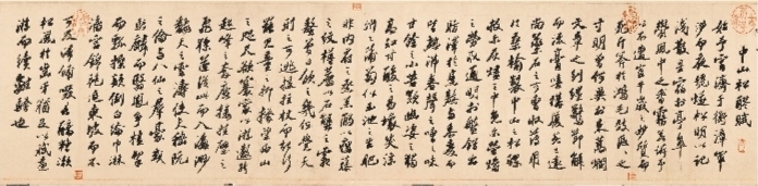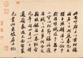 该作品书写于1094年,那一年苏轼59岁。他在被贬岭南时因雨受阻于襄邑(今河南睢县),当即兴致勃勃,挥毫将以前写过的《洞庭春色赋》《中山松醪赋》誊写于手卷上。《洞庭中山》二赋既是写酒,又是抒怀,抒发因仕途坎坷而郁结在心中的不平。文章豪放畅达,想象丰富,书法沉雄劲健,一气呵成,珠联璧合,堪称双绝。