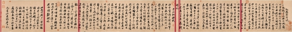 当年的苏轼怎么也想不到,他在被贬途中即兴书写的长卷,历经近千年竟让一代又一代的后人为之倾倒。清乾隆皇帝十分喜爱《洞庭中山》二赋,曾4次在此卷上题跋,赞曰:“精气盘郁豪楮间,首尾丽富,信东坡书中所不多觏。”此外,该卷拖尾处有元人张孔孙,明人黄蒙、李东阳、王辞登、王世懋、王世贞、张孝思的题跋和题诗。明代书法大家张孝思题赞二赋跋曰:“此二赋经营下笔,结构严整,郁屈瑰丽之气,回翔顿挫之姿,真如狮蹲虎踞。”明代书画鉴藏家王世贞则称:“此不惟以古雅胜,且姿态百出,而结构谨密,无一笔失操纵,当是眉山最上乘。观者毋以墨猪迹之可也。”