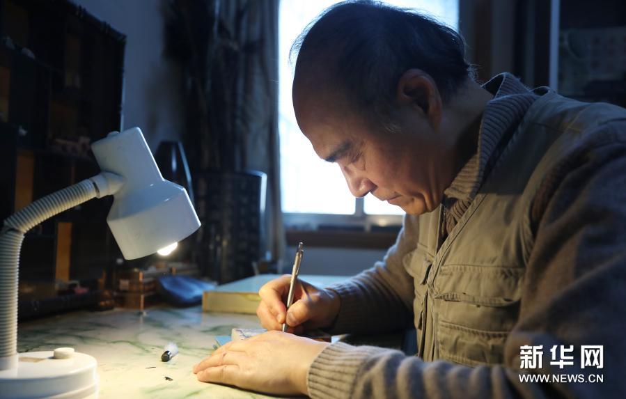 12月16日,“济南微雕”山东省级非物质文化遗产代表性传承人王天明进行微雕创作。新华社发(赵晓明 摄)