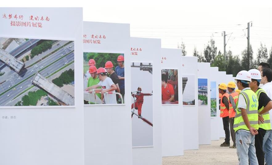 9月23日,在中铁四局新建福厦铁路8标段工地,建设者在参观工地摄影展。 当日,一场由高铁一线建设者参与拍摄、布展的工地摄影展9月23日,在中铁四局新建福厦铁路8标段工地,一名参展者向工友介绍摄影作品。 当日,一场由高铁一线建设者参与拍摄、布展的工地摄影展