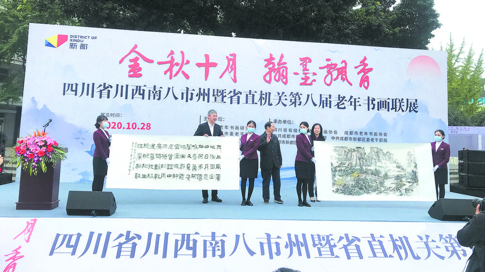 10月28日上午,由四川省老年书画研究会、中共成都市委老干部局、中共成都市新都区委、成都市新都区人民政府联合主办的“金秋十月、翰墨飘香——川西南八市州暨省直机关第八届老年书画联展”在新都区黄桷树广场举行。