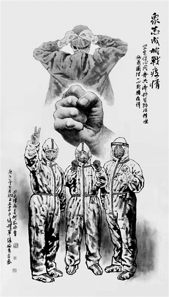 大年初三,天津市文联副主席、天津市美协主席王书平与天津市美协副秘书长张福有创作出六尺整张作品《英姿》,向战斗在抗击疫情第一线的“白衣天使”致敬。西安画家王犇用国画作品《待发》,着重表现一线医护人员进入病区前穿戴防护服的瞬间:口罩掩不住淡定自信的表情,厚重的防护服衬托出坚定沉着和娴熟操作的双手。他说,《待发》是在非常揪心的心情下构思,在心里琢磨了两天,落笔完成只用了两小时,只愿能用手中的画笔,为抗击疫情的英雄们打气加油,尽一点自己的微薄之力。1月30日,96岁高龄的美术家黄永玉创作出《中国人活得有气势》,醒目的红十字旁,是象征胜利的“剪刀手”,配有“中国人活得有气势”的文字,以笔墨传达全国人民战胜疫情的必胜信念。