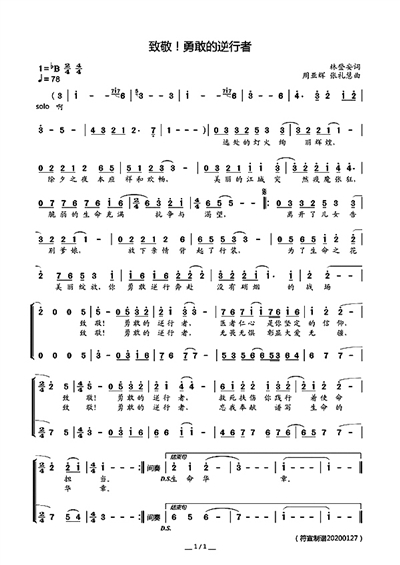 抗击疫情主题歌曲《致敬!勇敢的逆行者》曲谱。资料图片
