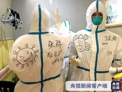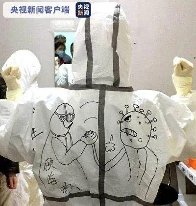 为消除孩子们的恐惧,护士在防护服上画画,这是江苏支援黄石医疗队队员南京市儿童医院护士马良超进入隔离区前拍摄的照片。