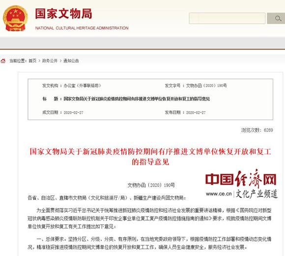 国家文物局关于新冠肺炎疫情防控期间有序推进文博单位恢复开放和复工的指导意见