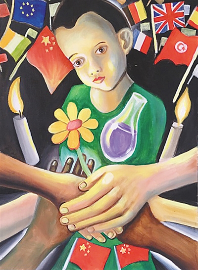 在油画《全世界携手抗击新冠病毒》中,身着绿色衣服的孩子象征着爱与希望,不同肤色的手交叠在一起寓意团结与祝福,鲜艳的花朵象征着生命的蓬勃,蜡烛则是衷心地祈愿人们早日恢复往日生活。创作这幅作品的英国艺术家丽贝卡·文森吉是一位美术老师,2019年她携作品来到中国,参加了在中国美术馆展出的第八届北京国际美术双年展,自此便和中国结下不解之缘。自疫情暴发之后,她一直关注着疫情的发展变化,用7天时间完成了这幅作品,以表达对全球人民的声援和祈祷。