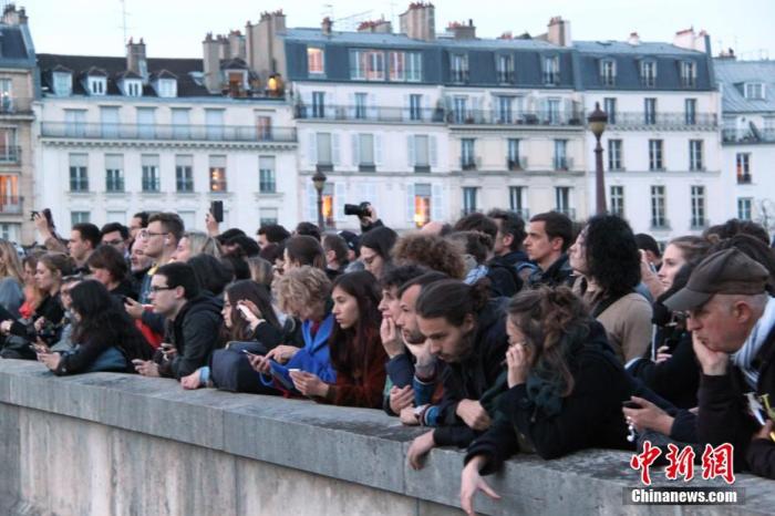 资料图:当地时间2019年4月15日晚,法国巴黎圣母院发生大火,引发民众高度关注,众多民众在现场附近聚集。中新社记者 李洋 摄
