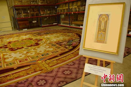 资料图:当地时间2019年9月21日,在法国文化部展出的巴黎圣母院顶级文物、长达25米的“唱诗班地毯”。中新社记者 李洋 摄