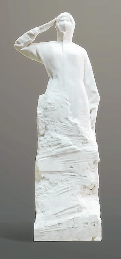 雕塑家尝试通过塑造一系列无名英雄的形象,来体现文心铸魂的文化力量。以吴为山的雕塑《使命》为例。作品塑造了抗疫期间青年白衣战士的典型形象:她身穿厚重的防护服,敬军礼的姿势透露着利落、果敢、坚毅与庄严。作品造型手法简洁洗练,表现语言自信大胆。朝气蓬勃的女青年形象与苍劲质朴的山石肌理构成强烈的视觉对比,挺拔的身姿与洁白的汉白玉融为一体,化作一座不朽的山峰。她是这一特殊时期青年军医的形象代表,是军魂的神圣象征,也是众志成城的伟大精神纪念碑。