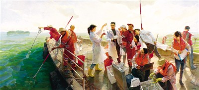 在新近验收完成的国家主题性美术创作项目作品中,也出现了较多表现劳动者的精品。例如,商亚东的油画《最美太湖水》,表现了十余位青年科技人员在太湖上检测水质。人们忙碌的身影在逆光下显得多姿多彩、充满朝气。湖光山色增添了劳动的灵性,使画面具有浪漫的诗意氛围。“最美太湖水”是实施可持续发展战略、建设美丽中国的重要案例,突出了科技治水、科学管水的环保理念。