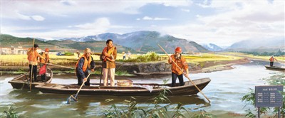 任志忠、金临的《河长巡河》,则以扎实的造型、优美的构图,表现了“河长制”对于绿水青山的重要性。画面中,船中央的河长眺望前方,引领着船队巡河,右边的撑船者扭头回看河长和左边的打捞工作者。河中,碧波荡漾、水草丰茂。船后,辛勤的劳动者、收割机与金色的稻浪形成辽阔的劳动场景。更远处,但见青山旖旎,白云舒卷,一派秀丽河山。作品生动地诠释了“绿水青山就是金山银山”的主题。