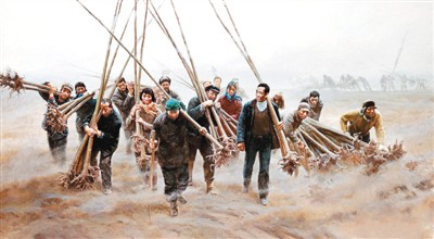 毛本华、王刚、鲍璐、郝米嘉的油画《焦裕禄》,是国家重大历史题材美术创作工程的结项作品,表现了在20世纪60年代初的兰考,焦裕禄带领群众扛树苗走向盐碱地的场景。画面中,十余位劳动者群像被塑造在漫天风沙的环境中,充满张力。画中的焦裕禄形象朴素、平易近人,纯朴的农民们形态各异。画家以饱满的情感、成熟的技巧、和谐的章法和统一的氛围,塑造了感人至深的人民公仆形象。