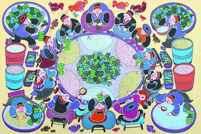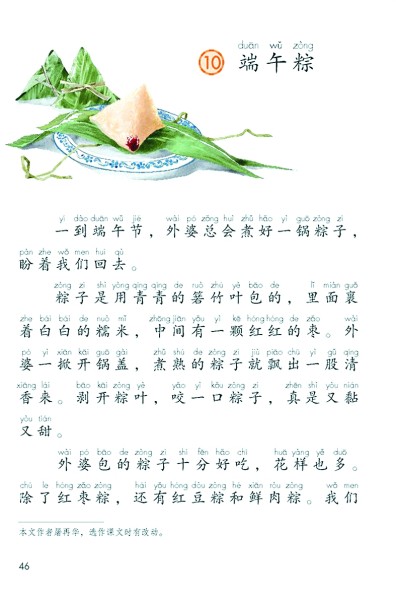 当代作家也有滋有味地描绘“舌尖上的端午”。“端午节,我们那里的孩子兴挂‘鸭蛋络子’。头一天,就由姑姑或姐姐用彩色丝线打好了络子。端午一早,鸭蛋煮熟了,由孩子自己去挑一个,鸭蛋有什么可挑的呢?有!一要挑淡青壳的。鸭蛋壳有白的和淡青的两种。二要挑形状好看的。别说鸭蛋都是一样的,细看却不同。有的样子蠢,有的秀气。挑好了,装在络子里,挂在大襟的纽扣上。这有什么好看呢?然而它是孩子心爱的饰物。鸭蛋络子挂了多半天,什么时候孩子一高兴,就把络子里的鸭蛋掏出来,吃了。端午的鸭蛋,新腌不久,只有一点淡淡的咸味,白嘴吃也可以。”(汪曾祺《端午的鸭蛋》,人教版八年级语文下册)“粽子是用青青的箬竹叶包的,里面裹着白白的糯米,中间有一颗红红的枣。外婆一掀开锅盖,煮熟的粽子就飘出一股清香来。剥开粽叶,咬一口粽子,真是又黏又甜。”(屠再华《端午粽》,部编版一年级语文下册)鸭蛋咸美、粽子飘香,包裹在食物里的,是作家关于家乡和故人的美好回忆。这些文化记忆代代相传,凝结成中国人关于端午的“节日味道”。