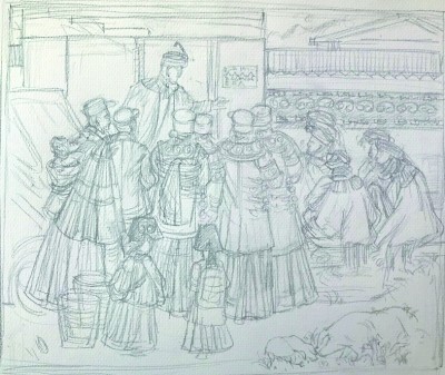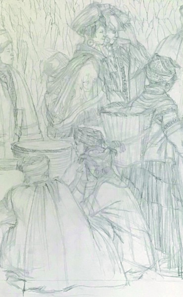 在画稿修改过程中,各种不同意见汇聚在一起。无数次的开会讨论中有争执、分歧,甚至意见不统一而影响到工作进度。但是大家只有一个目标,就是用最大的力量最真挚的描绘来完成这张作品,最终总能统一思想,达成共识。协作进程中形成了两张草图入围。第一张描绘的是草莓大丰收的场景;第二张是村支书和众村民在车站喜迎受到脱贫示范户表彰的村民代表。第一张草图虽然生动,但是人物组织略显散乱,同时也考虑背景大棚的造型处理起来是否美观;第二张草图主题人物处于黄金分割处,人物组织松紧有度。最终我们选出了第二张草图作为最终方案。