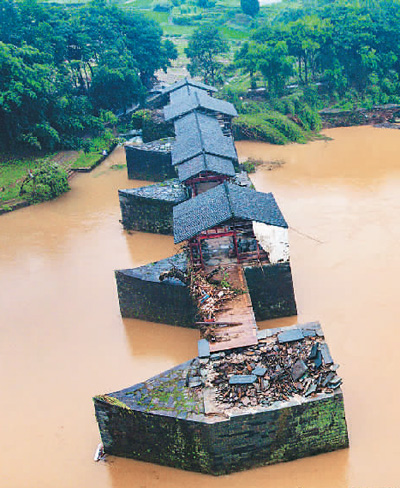 7月10日,在江西省婺源县清华镇拍摄到的遭洪水冲毁的彩虹桥。王国红 摄/人民视觉