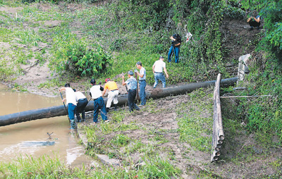 工作人员搬运被洪水冲到下游的彩虹桥大梁。婺源县文物局 供图