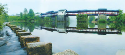 婺源彩虹桥始建于南宋,距今已有800多年历史,是国内保存最完整、设计最科学的古廊桥之一,被列入第六批全国重点文物保护单位。桥全长140米、宽3.1米,宛如一道彩虹横跨河流最宽处。桥墩的设计很有特色,前端形状像船头,当地人称为“燕嘴”,能分流河水降低冲力。4个桥墩间的距离不同,河水流速快的地方间距较大。这样的设计让彩虹桥具有较强的抗洪能力,故能历经800多年保存至今。