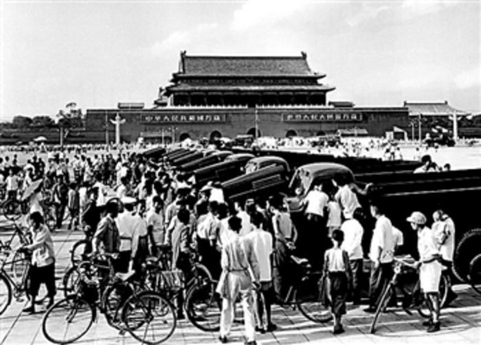 2019年10月1日上午,庆祝中华人民共和国成立70周年大会在北京天安门广场隆重举行。图为群众游行中的“祖国万岁”方阵。近日,由北京出版集团主办的“影像北京 民生记忆”图片展开幕式在北京市方志馆举行。