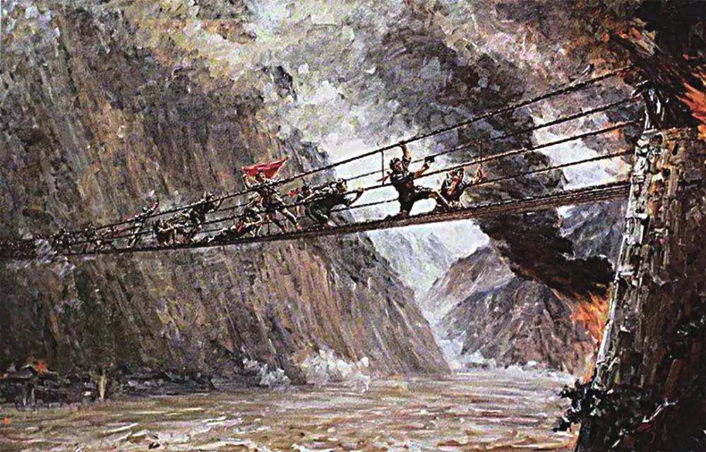 1935年5月29日,中央红军红一军团第四团22名共产党员和积极分子组成的突击队,在连长廖大珠的率领下,冒着敌人密集的火力,攀踏着悬空的铁索链,奋勇向泸定桥对岸冲去。当勇士们接近桥头时,丧心病狂的敌人突然点起冲天大火,企图阻挡红军前进的步伐。但英勇无畏的红军战士义无反顾,跳进火海,打退了守敌,胜利地夺占了大桥,攻克了泸定城,打开了中央红军北上的道路,为中国革命立下了不朽功勋。油画《飞夺泸定桥》,将红军勇士不怕牺牲,勇往直前的大无畏革命精神永远定格在了奔腾咆哮的大渡河之上,镶嵌于中国革命的史册。