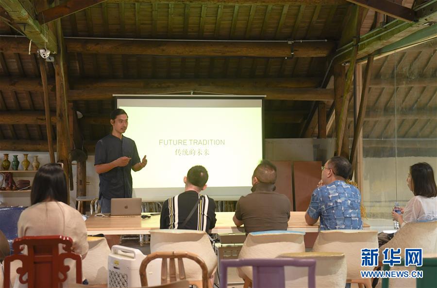 8月22日,图书馆创始人、设计师张雷(站立者)向来访者介绍图书馆情况。 在杭州余杭青山村,有一个名为融设计图书馆的空间。这里对中国传统文化、艺术与工艺材料进行梳理,除了从各地收集的数以千计的传统手工艺品,图书馆还集聚了上百位国际设计师以此为灵感的再创作。同时,图书馆也藏有大量设计相关书籍,供来访者查阅。 新华社记者 翁忻旸 摄